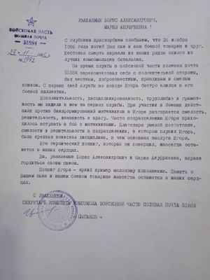 Игорь выполнял приказ и был верен военной присяге. В Баграме он вместе с другими товарищами занимался ремонтом боевой техники, приводил её в готовность к боевым операциям. Вместе с товарищами ему не раз приходилось смотреть смерти в глаза, учувствовать в боевых операциях. «Привет из Афганистана! Здравствуйте, мои дорогие мама, папа, Ира и Миша.», - так начинались письма от Игоря. – «За меня не расстраивайтесь, здесь тихо и не стреляют, так что бояться не нужно. Вы не верьте про Афганистан, что пишут в газетах и показывают по телевизору, тут мирная жизнь, не верьте, что здесь идёт война. Это всё неправда.», - успокаивал он маму. Часто интересовался жизнью односельчан, родных и друзей, особенно спрашивал о тех, кто ушел и пришёл со службы.