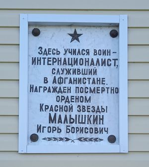 В 1988 году на здании Карачельской средней школы была установлена мемориальная доска с надписью: «Здесь учился воин-интернационалист, служивший в Афганистане. Награжден посмертно орденом Красной Звезды Малышкин Игорь Борисович».