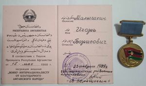 - Медаль «Войну-интернационалисту от благодарного афганского народа» - государственная награда Демократической Республики Афганистан в соответствии с Указом Президента Республики Афганистан от 15 мая 1988 года, удостоверение от 23 февраля 1989 года.