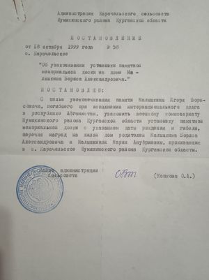На основании Постановления Администрации Карачельского сельсовета Шумихинского района Курганской области от 08.12.1999г. № 63 «О наименовании улиц», одна из улиц села Карачельское названа именем Игоря Малышкина. «Переулок имени Игоря Малышкина» — это улица, на которой находится дом, где жил Игорь.