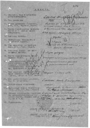 - Место рождения - Курская обл., Больше-Полянский р-н, с.Б-Поляна (жена- Белоглазова Марфа Федоровна). Дата и военкомат призыва - 22.06.1942 Больше-Полянским РВК. Место службы -. Воинское звание - красноармеец. Причина выбытия - пропал без вести (писем не было). Дата выбытия -. Место выбытия - . Место захоронения- . Источник - ЦАМО, "Memorial. Документы о погибших воинов" "Информация из документов, уточняющих потери" фонд №58 опись №18004 дело №582 (Большеполянский РВК, 28.10.1946). (www.obd-memorial.ru)