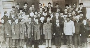 Уроженцы Арлагульской волости д. Прилогино, 1900гг. Слева направо: сидит на стуле - Захаров Степан (участник Первой Мировой войны), верхний ряд: 1-я Захарова Соломея.