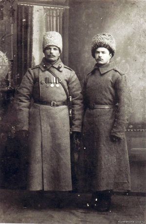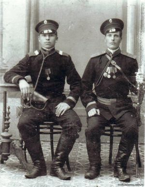 Слева направо: 1-й Фельдфебель 17-го Восточносибирского полка Приамурского военного округа, уроженец д. Песьяная - Васильев Федор Иванович, (1881-1954гг.); Фото Николая Толстых, с сайта www.kurgangen.ru