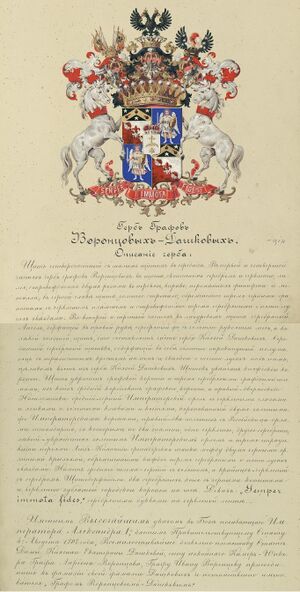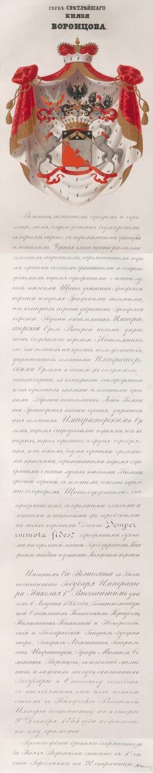 | Михаил Илларионович, генерал-поручик, старший сын Лариона (Иллариона) Воронцова), канцлер. В 1744 г. был пожалован императором Карлом VI в графское римской империи достоинство, и тогда же ему позволено пользоваться этим титулом в России. Его братьям Роману и Ивану Илларионовичам было даровано графское достоинство в 1760 г. императором Францем I; это достоинство признано за ними в России лишь в 1797 г.