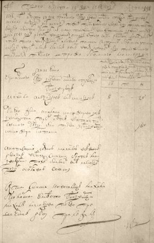 1762 года августа дня Чернавского уезда д(е)р(е)вни Нижнего Стрельца однадворецъ Михайло Александров с(ы)нъ Мясоедов по силе публякованного в прошлом 1761 году генваря 26 дня правительствующего сената указу дал сию скаску о положенных в нижеписанной селе по последней 1747 году ревизии в подушном окладе и с того числа разными случаями убыли и после того внов(ь)рожденныхъ и об(ъ)являх по самой истине безъ всякой утайки а буде впредь к семъ обличенъ явлюсь втоимъ повиненъ буду положенного по указамъ тяжкого штрафа безъвсякаго милосердия