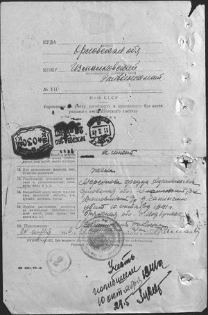 - Место рождения - Орловская обл., Измалковский р-н, д.Чаплыгино (родственников нет). Дата и военкомат призыва - Ленинский РВК, Московская обл., г.Москва. Место службы - 4 сд ВВ НКВД. Воинское звание - рядовой. Причина выбытия - отстал от части. Дата выбытия - 27.09.1943. Место выбытия - ст.Аксай. Место захоронения- . Источник - ЦАМО, "Memorial. Документы о погибших воинов" "Информация из донесения о безвозвратных потерях" РГВА фонд №38672 опись №1 дело №533. (www.obd-memorial.ru)