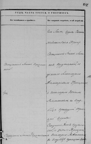 | Счетъ умершихъ. | Месяцъ и день. | Званiе, имя, отчество и фамилiя умершаго. | Лъта умершаго | Отъ чего умеръ | Кто исповъдалъ и прiобщалъ | Кто совершалъ погребенiе, и гле погребены | |||