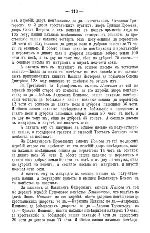 Пашни паханые помещиковы наездом 10 чети да крестьянские и бобыльские пашни паханые 3 чети да перелогом 20 чети да дикаго поля 17 чети И обоего пашни паханые помещи | |