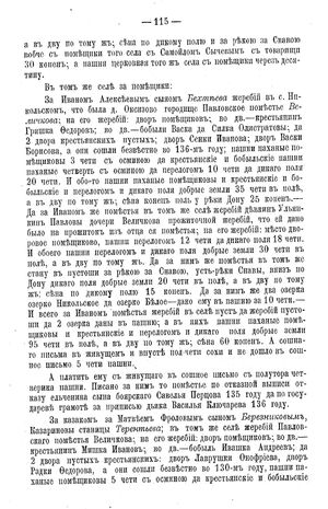 Пашни паханые помещиковы 3 чети с осминою да перелогом 10 чети да дикаго поля 20 чети И обоего пашни паханые помещиковы и крестьянские и бобыльские и перелогом и дикаго поля добрые земли 35 чети в поле а в дву по томуж[1] сена 25 копень Да за Иваном же поместья в том же селе жеребий[2] девкин Ульянкин Павловы дочери Величкова прожиточный жеребий[2] что ей дано было на прожиток из отца ея поместья. На его жеребий[2]: И обоего пашни перелогом и дикаго поля добрые земли 30 чети в поле а в дву по томуж[1] Да за ним же поместье в том же стану в пустоши за рекою за Сновою усть реки Снавы вниз по Дону дикаго поля земли 20 чети в поле а в дву по томуж[1] сена по дикому полю 15 копень Да за ним же два озерка: озерко Никольское да озерко Белое - дано ему в пашню за 10 чети И всего за Иваном поместья жеребий[2] в селе пусте да жеребий[2] пустоши да 2 озерка даны в пашню а в них пашни паханые помещиковы и крестьянские и перелогом и дикаго поля добрые земли 95 чети в поле а в дву по томуж[1] сена 60 копень А сошнаго письма[3] в живущих и впусте пол-чети сохи и не дошло в сошное письма[3] 5 чети пашни А платить ему с живущего в сошное письмо[3] с полутора четверика пашни