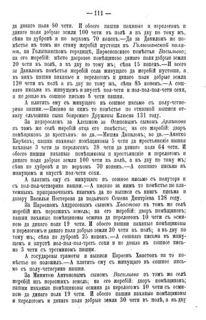 Пашни паханые помещиковы 2 чети да крестьянские пашни паханые четверть без полу-осмины да перелогом 37 чети с осминою да дикаго поля 60 чети И обоего пашни паханые помещиковы и крестьянские и перелогом и дикаго поля земли 100 чети в поле а в дву по томуж[1] сена по дуброве и по верхам 70 копень А сошнаго письма[3] в живущих и впусте пол-чети сохи А платить им с живущего в сошное письмо[3] с четверика пашни