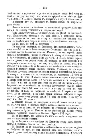 Пашни паханые помещиковы наездом 2 четверти с полу-осминою и с четвериком да перелогом 10 чети да дикаго поля 30 чети И обоего пашни паханые наездом и перелогом и дикаго поля земли 42 чети с полу-осминою и с четвериком в поле а в дву по томуж[1] сена по дуброве 35 копень Да за Гаврилом же в поместье в пустоши Мартинове поляне дикаго поля добрые земли 10 чети в поле а в дву по томуж[1] сена 17 копень И всего за Гаврилом в поместье 2 жеребия[2] в селе пусты да в пустоши а в них пашни паханые наездом и перелогом и дикаго поля добрые земли 76 чети в поле а в дву по томуж[1] сена 69 копень А сошнаго письма[3] в живущих и впусте пол-пол-чети и пол-пол-чети сохи перешло сверх сошнаго письма[3] четь пашни