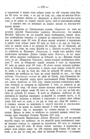Пашни паханые помещиковы наездом 7 чети да бобыльские пашни паханые 2 чети да перелогом 11 чети да дикаго поля 30 чети И обоего пашни паханые помещиковы и бобыльские и перелогом и дикаго поля добрые земли 50 чети в поле а в дву по томуж[1] Сена по дуброве 30 копень Да за Абрамом же поместья в том же стану жеребий[2] починке, что было пустошью Полохнино Селище на р.Снова под Снавским лесом На его жеребий[2]: