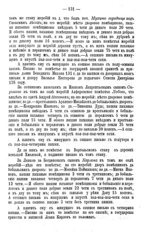 Пашни паханые 7 чети да крестьянские и бобыльские пашни паханые 3 чети да перелогом 15 чети да дикаго поля 25 чети И обоего пашни паханые помещиковы и крестьянские и бобыльские и перелогом и дикаго поля добрые земли 50 чети в поле а в дву по томуж[1] Сена по заполью у реки Дону 40 копень Да за ним же поместье в | |