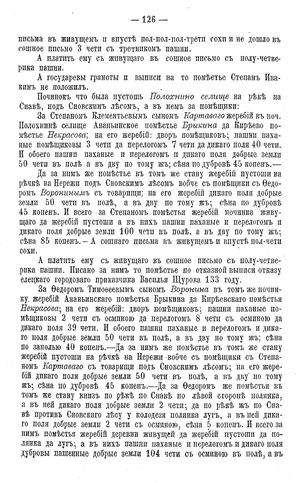Да за ним же поместье в том же стану пустошь на речке Нережи вобче с помещики с Степаном Картаваго с товарищи под Сновским лесом На его жеребий[2] дикаго поля добрые земли 50 чети в поле а в дву по томуж[1] Сена по дубраве 45 копень Да за Федором же поместья в том же стану вниз по реке по Сраве по левой стороне полянка а в ней дикаго поля добрые земли 2 чети с осминою да по реке же по Снаве против Сновского лесу у колодезя полянка луг а в ней дикаго поля добрые земли 2 чети с осминою сена 5 копень И всего за ним поместья жеребий[2] деревни живущей да жеребий[2] пустоши да полянка да луг а в них пашни паханые и перелогом и дикаго поля дубровы пашеные добрые земли 104 чети с осминою в поле а в | |