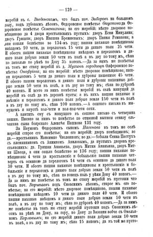 Пашни паханые помещиковы 4 чети да крестьянские и бобыльские пашни паханые четверть с осминою да перелогом 14 чети с осминою да дикаго поля 30 чети И обоего пашни паханые помещиковы и крестьянские и бобыльские и перелогом и дикаго поля добрые земли 50 чети в поле а в дву по томуж[1] Сена по конец поль у реки Дону 40 копень