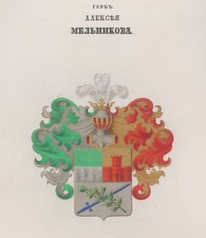 "Герб коллежского асессора (ныне Коллежский Советник) Сергея Александрова Мельникова признан в потомственном дворянстве, с правом на внесение в третью часть дворянской родословной книги, по пожалованному отцу его коллежскому асессору Александру Киприянову Мельникову, 22-го Сентября 1859 года, ордену Св. Владимира четвертой степени. " |