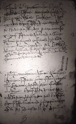 Того ж числа по помете окол(ь)ничего Ивана Офонас- евича Гавренева на описке какову писали к ве- ликому г(осу)д(а)рю ц(а)рю и великому кн(я)зю Алексею Михайло- вичю всей великая и малыя и белыя России само- державцу из Киева бояринъ и воеводы Василей Борисович Шереметюв с товарищи стародубцу Миките Васильеву с(ы)ну Офросимову великого г(осу)д(а)ря | |