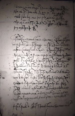 жалованья за полонское терпенье и за выход пять рублев да кормовыхъ денего на две недели по алтыну на день дано В прошлом во РѮS (166/1658)м году перед черкаскою войной послан он Микита был из Киева из полку боярина и воеводы Василья Бо- рисовича Шереметева с товарыщи в Белую Ц(е)рковъ к черкаскому полковнику к Ивану Кровченку с листомъ и в Белой Ц(е)ркви был он задержанъ и отослан был из Белой Ц(е)ркви к изменику к Да- нилку Выговскому в черкаской город в Смелой сиде(л) он в том городе в тюр(ь)ме А из Смелого Да- нилко Выговской прислал ево к боярину и воевода назад в Киев с листомъ же в прошлом во РѮЗ (167/1659)м году апреля въ Ѳ (9) де(нь)