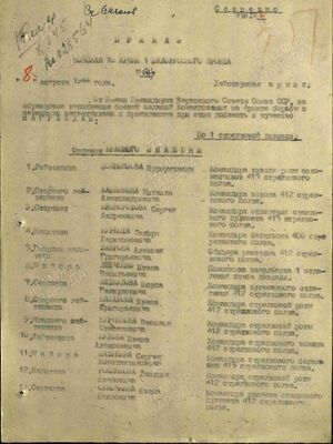 - орденом "Красного Знамени" приказом командующего войсками 70 Армии 1-го Белорусского фронта номер 073/н от 8 августа 1944 года: