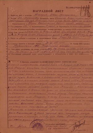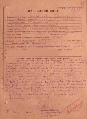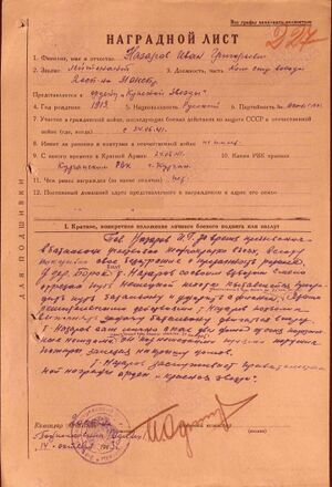 "Тов. Назаров И. Г. 2.11.44г., в бою за дер. Прудок Невельского района Калининской области, командуя взводом, смело и решительно вел свой взвод на штурм опорного пункта противника. В момент, когда был ранен командир роты капитан Алексеев, тов. Назаров взял на себя командование ротой. В бою, за высоту "Безымянную", что юго-западнее 200-300 метров дер. Савино Новосокольничевского района Калининской области тов. Назаров, командуя ротой, первым, со своей ротой ворвался на данную высоту. В этом бою, будучи ранен, не оставил командование ротой, пока не закрепился на занятой высоте. Когда ему предложили уехать в госпиталь на излечение, он заявил ,,Никуда из своего полка не уеду" и остался в своей санроте. Достоин правительственной награды ордена ,,Отечественной войны II-й степени."