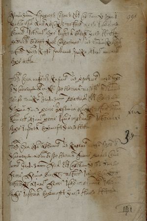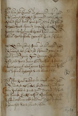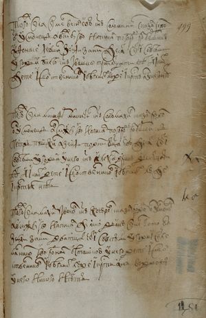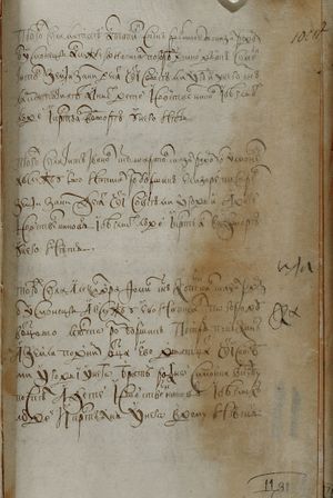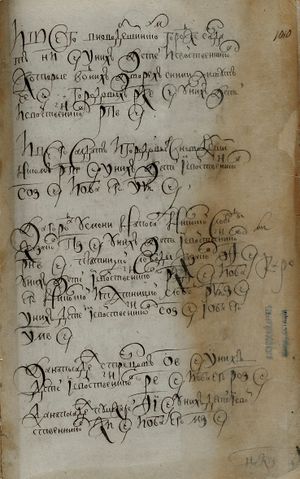 того ж числа Агей Григор(ь)евъ с(ы)нъ Хрипунов сказал родомъ он усмонецъ А в службу ево написал Семен Ива- новичь Заборовской Земли за нимъ дватцат(ь) чети со всеми угод(ь)и(ми) У него с(ы)нъ Тимошка уве- чен рукою А иных детей и свойственниковъ и бе- глыхъ людей и кр(е)стьян во дворе у него нетъ