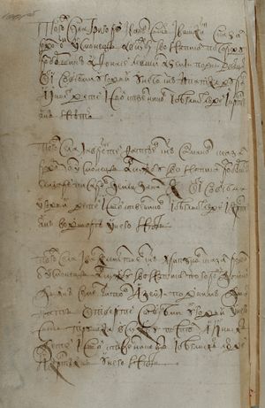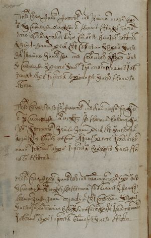 того ж села Микифор Яковлев с(ы)нъ Паневин сказал родомъ он усмо- нецъ А в службу ево написал по городу воевода Иванъ Пятой А земли под нимъ отца ево дватцат(ь) чети со всеми угод(ь)и(ми) У него с(ы)нъ Гаврилка пяти лет А иных детей и свойственниковъ и беглыхъ людей и кр(е)стьян у него в дому нетъ