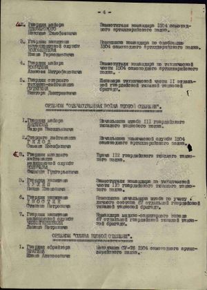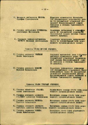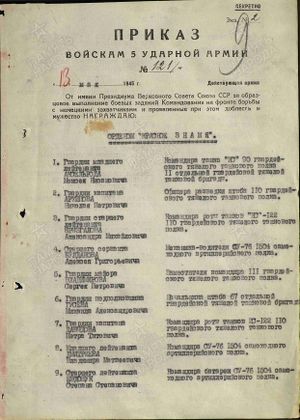 Наградной документ Дата рождения: __.__. Наименование военкомата: Лебяжьевский РВК, Курганская обл., Лебяжьевский р-н. Дата и место призыва: Лебяжьевский РВК, Курганская обл., Лебяжьевский р-н. Дата поступления на службу: 25.06.1941. Воинское звание: гв. ефрейтор. Воинская часть: 1504 сап. Кто наградил: ВС 8 гв.А. Наименование награды: Орден Славы III степени. Номер документа: 480/н Дата документа: 17.02.1945. Место призыва: Лебяжьевский РВК, Курганская обл., Лебяжьевский р-н. Приказ подразделения №:480/н от: 17.02.1945. Издан: ВС 8 гв. А. Архив: ЦАМО фонд 33 опись 687572 дело 620 |