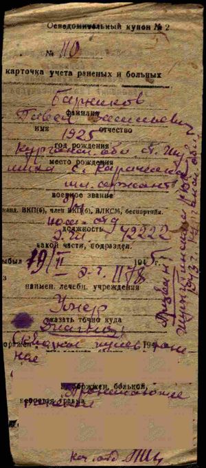 Место рождения: Курганская обл., ст. Шумиха, с. Карачельское. Наименование военкомата: Шумихинский РВК, Курганская обл., Шумихинский р-н. Дата и место призыва: Шумихинский РВК, Курганская обл., Шумихинский р-н. Дата призыва: __.__.1943. Воинское звание: мл. сержант. Последнее место службы: эш 42222. Дата выбытия: 19.02.1945. Причина выбытия: умер от ран. Госпиталь: ЭГ 1178