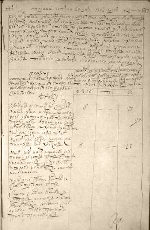 1762 года мая дня Чернавского уезду села Салдацкого однадворецъ Логвинъ Степанов с(ы)нъ Семендяевъ по силе публякованного в прошлом 1761 году правительствующего сената указу дал сию скаску о положенных в нижеписанномъ селе Салдацкомъ по последней 1747 году ревизии в подчином окладе и с того числа разными случаями убыли и после того внов(ь)рожденныхъ и об(ъ)являх по самой истине безъ всякой утайки а буде впредь к семъ обличенъ явлюсь втоимъ повиненъ буду положенного по указамъ тяжкого штрафа безъвсякаго милосердия