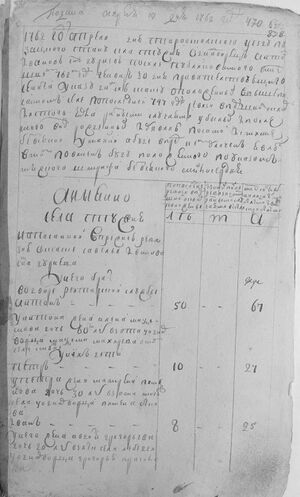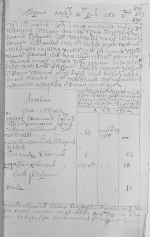 1762 году апреля дня Старооскольского уъзду пузацкого стану села стуженя однодворец Антон Иванов с(ы)нъ Дурнев по силе публикованного впрошломъ 762 году Генваря 9 дня правителствующего сената указу дал сию скаску о положенных в ниже писанномъ селе по последней 1747 году ревизiи в подушномъ окладе с показанием ис того числа разными случаями убыло и после ревизiи вновь рожденныхъ обявлят поса и прибылых по самой истине безъ всякой утайки а буде кемъ впредь обличенъ явлюсь или по свидетельству найдется что кого либо утаилъ то повиненъ положенному по указамъ штрафу безъ всякаго милосердия