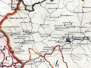 Файл:1780Миропольский8 Харьковской.jpg 1780 г.. Фрагмент карты генерального межевания Миропольского уезда Харьковской губернии |