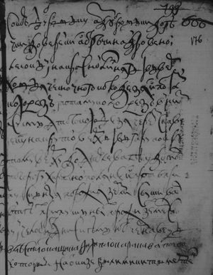 | 176 (обр.) | Окораков по челобитю чернавцев дет[еи] боярских Ивана Матвеива сына Климов[а] да Степана Тимофеива сына Пон[а]морева приехов в Чернавскои уезд под Яковлев лес в Красную поляну в Миха[ило]вскои приход в припускьную порожею землю в вурочищи за реку Сосну от Навасилскои деревни от Тонькова рогу по б[ол]шому ржавцу к Снаве реке х Крутом[у] кусту.