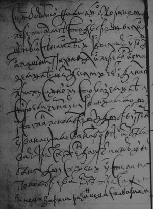 | 175 (обр.) | Окораков по челобитю чернавцев дет[еи] боярских Ивана Матвеива сына Климов[а] да Степана Тимофеива сына Пон[а]морева приехов в Чернавскои уезд под Яковлев лес в Красную поляну в Миха[ило]вскои приход в припускьную порожею землю в вурочищи за реку Сосну от Навасилскои деревни от Тонькова рогу по б[ол]шому ржавцу к Снаве реке х Крутом[у] кусту.