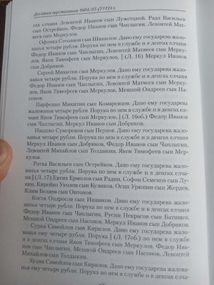 Степан Семенов сын Левыкин Дано ему госудорева жалованья четыре рубли Порука по нем в службе и в ден(ь)гах елчаня Яков Тимофеев сын Меркулов Осип Иванов сын Коверин Левонтей Иванов сын Лужетцкой Федор Иванов сын Чеплыгин Максим Микитин сын Комаревцов