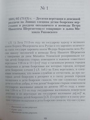 №1 1604/05 (7113) г. - Десятня верстания и денежной раздачи на Ливнах елецким детям боярским верстания и раздачи окольничего и воеводы Петра Никитича Шереметева "с товарищи" и дьяка Михаила Унковского