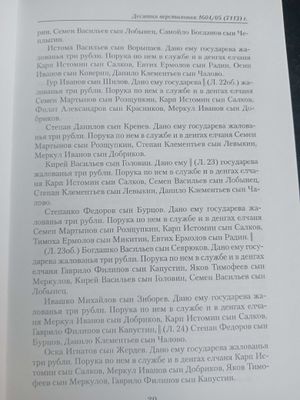 Гриша Герасимов сын Гребенкин Дано ему госудорево жалованья пять рублев Порука по нем в службе и в ден(ь)гах елчаня Семен Федоров сын Пашков Офонка Олексеев сын Измалков Лксен Семенов сын Ондропов Федор Ондреев сын Насонов