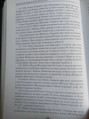 Семен Офонасьев сын Федюнин Сказали про нево окладчики и сам Семен поместья за ним в дачах 100 чети за ним в том поместье крестьян 1 человек да 2 бобыля А будет под ним на государеве службе с тово поместья кон(ь) в полку ружья саадак да сабля да за ним будет в кошу человек на возу Поместья ево под худа Сказал Семен писал де я тое службу надеючись на государево жалованье Собою Семен лист 109 об добр Денег ему с городом 4 рубли