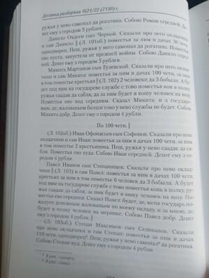 Самойло Семенов сын Зиборов Сказали про нево окладчики и сам Самойло сказал поместья за ним в дачах 100 чети за ним в том поместье 2 бобыли Поместья ево худа А будет у нево на государеве службе с тово лист 112 поместье меринок в возу ружья самопал да рогатина Сказал Самойло и с государевым де жалованьем болши тово службы не будет а писал де я тое службу надеючись на государево жалованья Собою Самойло середней Денег ему с городом 5 рублев