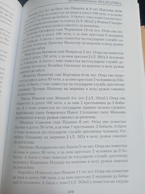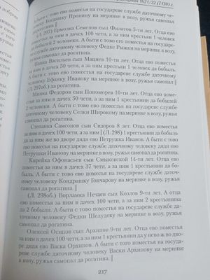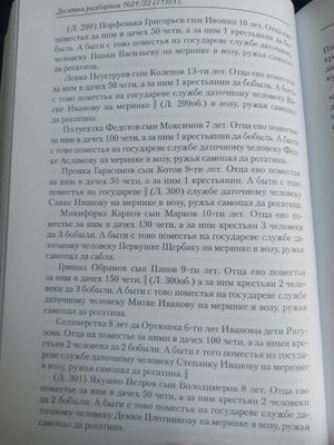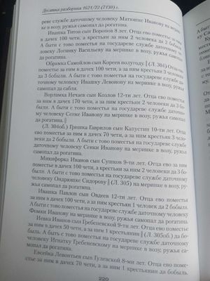 Олексей Осипов сын Архипов 9 лет Отца ево поместья за ним в дачех 100 чети а за ним 1 крестьянин да у нево ж во дворе дядя ево Васка Орхипов А быти с тово ево поместья на государеве службе даточному человеку Васки Архипову на меринке в возу ружья самопал да рогатина | |