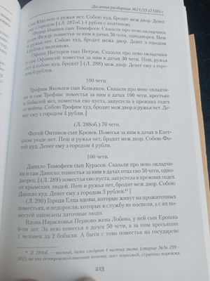 по 100 чети Трофим Яковлев сын Козьяков Сказали про него окладчики и сам Трофим поместья за ним в дачах 100 чети крестьян и бобылей нет Поместья ево пуста запустела в прежних годех от войны Собою Трофим худ бродит межъ двор(ов) и ружья нет Денег ему с городом 4 рубли лист 288 об по 70 чети Фотей Онтонов сын Кренев Помес(т)ья за ним в дачах в Елетцком уезде нет Пеш и ружья нет бродит межъ двор(ов) Собою Фотей худ Денег ему с городом 4 рубли