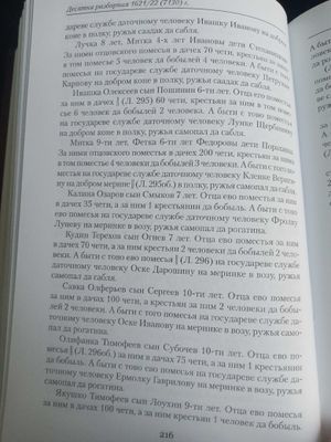 Олифанка Тимофеев сын Субочев 10 лет Отца ево помес(т)ья лист 296 об за ним в дачех 75 чети а за ним 1 крестьянин да бобыль А быти с тово ево помес(т)ья на государеве службе даточному человеку Ермолу Гаврилову на меринке в возу ружья самопал да рогатина