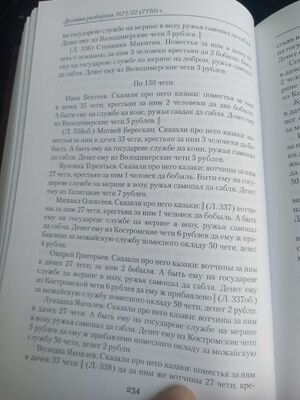 Юрька Кирилов Сказали про него казаки вотчины за ним в дачех 36 чети крестьян а ним 1 человек Сам Юрка пеш ружья у нево самопал да сабля Служба ево добра Денег ему из Костромской чети[3] 7 рублев да ему ж прибавлено за Можайскую службу помесного окладу 50 чети денег 3 рубли