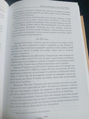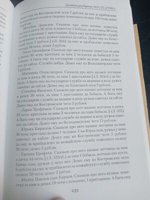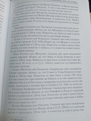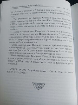 Казаки ж были елетцкие помещики окладчики про них сказали что они раздав свои вотчины пошли в боярские дворы и в моностыри в служки а иные воляютца по кабаком а поместья их розданы в роздачю лист 341 Васка Иванов Сказали про него казаки что он бил челом во двор врхиепискупу Сибирскому и пошел с ним в Сибирь А вотчины за ним было в Елетцком уезде 46 чети продал он тое вотчину московскому беломесному казаку слоботчику Микифорку Родионову А у Микифорка та вотчина взята и отдана в помес(т)ье елетцким помесным казаком ясаулом Гаврилку Родионову да Воинку Анненкову в помес(т)ье