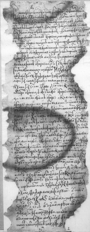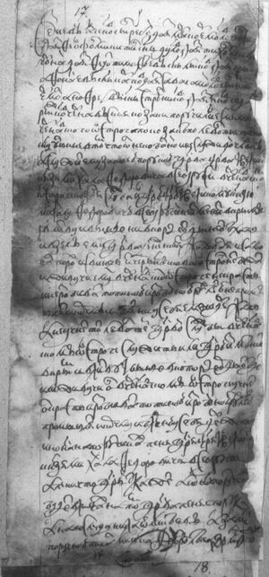 Феофон Микитин с(ы)нъ Дуваев да яз Федот Тимоф- еевъ сын Лыков да яз Григорей Офонас(ь)ев сын Карпов да яз Сава Самойлов сын Карповъ да яз Левонтей Титов с(ы)нъ Ул(ь)шин да яз Ермол Анофреев сын Стрел(ь)ников да яз Яков Сидоров с(ы)нъ Рыжков Чернавского острога казаки поручилис(ь) есмя (др. рус. - быть) мы тово ж Чернавского острога по казаке по Тихоне Яковлеве с(ы)не Чорнои в томъ что он вол(ь)- ной не служивой ч(е)л(о)в(е)къ и не из-за помещика кр(е)стьянинъ А служите ему г(осу)д(а)р(е)ва ц(а)р(е)ва и великого кн(я)зя Михайла Федоровича всея Русии в Чернавскомъ остроге козачье служба и г(осу)д(а)рю ц(а)рю великому кн(я)зю Михаилу Федоровичю всея Русии не изменит в Крымъ и в Литву и в и(н)ые ни в которые орды не от(ъ)ехатт и в земъ ему г(осу)д(а)р(е)ва денежное жаловон(ь)я и самопал порох и сви- нецъ из Чернавского острога не сбежат и поселитца ему в Чернавском остроге и в Чернавском остроге ему Тихону не красть и не разбивать татиною (судебную) и раз- бойною рухледью не промышлят(ь) и иным никаким воро- ством не вороват(ь) корчмы и бледни[1] у себя не держать А не учнет тот Тихон за нашею порукою г(осу)д(а)р(е)ва службы Чернавском остроге козачей служит(ь) или г(осу)д(а)рю изменит в Крым и в Литву или въ и(н)ые в ко- торые ... от(ъ)едет или учнет он в Чернавском остроге красть и разбиват(ь) или карчму и бледню[1] у себя учнет держат(ь) и нас на порутчинах пеня г(осу)д(а)ря ц(а)ря и великого князя Михайла Федоро- вича Всея Русии а пени что г(осу)д(а)рь укажетъ а ком у нас порутчиков будет в лицах на томъ г(осу)д(а)р(е)ва пеня и порука а на то послуси Да- нила Алексеевъ лета н-ЗР(МД (7144/1636) году | |