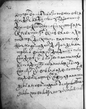 феевича Борзецова да подьячего Ивана Поликарпова Лета н-ЗРМЗ (7147/1639) и РМИ (7148/1640) году на Гремячем слобода беломесных каза- ков атамана Ильи Черного с товарыщи а служат они Государеву козачью службу с гремя- чевскими козаки ровно а в слободе це- рковь Богоявления господа Бога нашего Иисуса Христа да два редела Пребражения Господа Бо- га и Спаса н(а)ш(е)го Иисуса Христа да великия ….мученицы Парасковьи нари- цаемые Пятницы древеная… а в ц(е)ркве божие милосердие иконы … | |