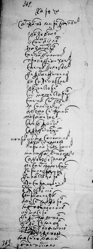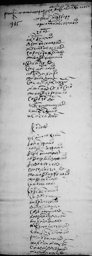 Оскол Осип Дураков Алексей Долгой Степан Долгой Павел Лукьянчиков ?.... ?...... Марка Чеснаковъ Филип Коптев Афонасей Чорной Савелей Коптев Свирид ?М..... Апат Яновъ Фома Скоков Абрам Скоков Роди(о)н Чорной Сомойло Кузнецов Прохор Шевцов ?Ерми(л) Хаустов Семен Дураков Лаврентей Мохрин Алексей Гранкин Яков Тотаринов (Татаринов) Иван Кондауровъ Афонасей ?Ал..тин Микита Шаколовъ Павел Долгой Яков Долгой Дементей ?...... Денис Терской Анисим Гончаров | |