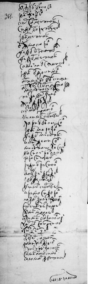 ?Антон Резанов Микифор Шишкин Иван ?..... Исай Арзамасцов Авдей Нечаев Петръ Свистунов Игнат Маликов Григорей Шишкин Федор Добрынин Тимофей Шишкин Яков Кузмин Андр... Кочарминской Дементей Туркин Фома Кузмин Игнат ?Кадомцов Афонасей Подгузов Михайло Ворыпаев Гаврила Обуховъ Михайла Ситников Павел Петин Семен Никонов Иван Суховской Савелей Горохов ?Але... Малышев Микита Кандауровъ Юр(ь)я Сатин Иван Ярцовъ Михайла ?..... Иван Курепоновъ Кузма Карповъ Хорлан Яблочков Софон Тырин Назар Лесунов Савелей Катаевъ Меркул Добрынин Павел ?Молчанов Захар Лесунов Савелей Поповъ Анур Тырин Денис Ростопчин Понкратей Тырин Костентин Андросов Максим ?.... Микита Муранов Гаврила Андросов Григорей Гаврилов | |