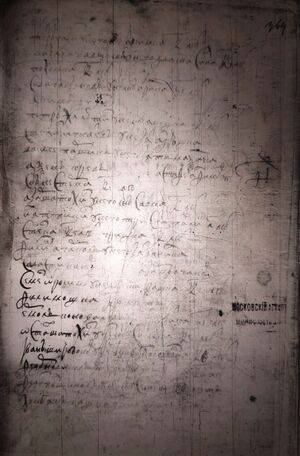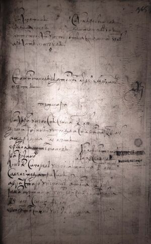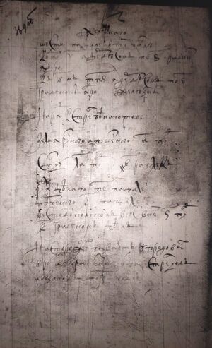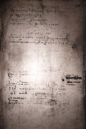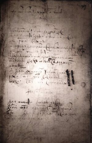 Город Чернавской рубленъ в дубовом лесу по городу две башни с проезжими вороты Да две башни глухих На башнях и по город кровли и мосты и лестницы погнили и опали по мере окола в сего города из башенными стены РПА (181) сажен(ь)[1] Из города тайник к реке Чернаве и тот тай- никъ верхъ | |