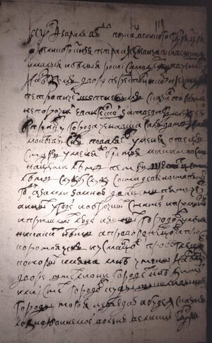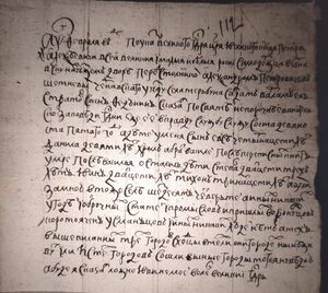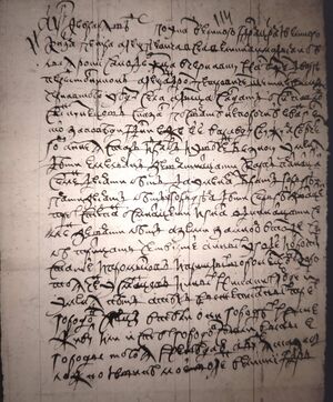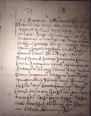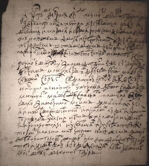 и великого кн(я)зя Петра Алексеевича всеа великия и малыя и белыя Росии самодержца в Чернав- ску на съезжем дворе перед стол(ь)ником Александром Петровичем Шетневымъ чернавской салдацкой пасынок Козма Игнатов с(ы)нъ Кутепов сказал по св(я)тей непо- рочной евангельской заповеди г(оспо)дни еже ей ей[1] в правду вотчим мой Петръ Андреевъ с(ы)нъ Матвеев служил со РЧЕ (195/1687)го салдацкою службу а я в службе ни в какой не написан У вотчима дети Сидар (в)ась- мнатцати Матвей шестнатцати Пашенной земли было за вотчимом моимъ дватцать чети А иных свойственников и пришлых людей из ыных городов у меня нет А про воронежцов и про коротоячен и усманцов про беглецов ко- торых имена мне чтены на съезжем дворе в техъ ли они городех н(ы)не живут или вышли из тех городов того я не ведою А будет я сказал ложно и в вины моей волен великий г(о)с(у)д(а)рь | |