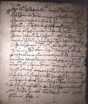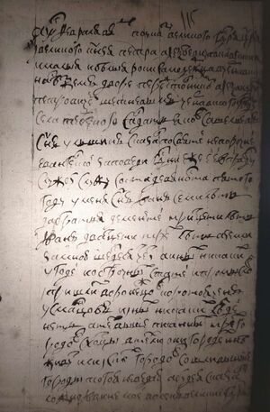 н-АѰ (1700) году февраля въ де(нь) по указу великого г(о)с(у)д(а)ря ц(а)ря и великого кн(я)зя Петра Алексеевича всеа великия и малыя и белыя Росии самодержца в Чернавску на съезжем дворе перед стол(ь)ником Александром Петровичем Шетневымъ сказал по св(я)тей непорочной евангельской заповеди г(оспо)дни еже ей ей[1] в правду города Чернавска салдатъ Трофим Лукьянов сынъ Ше- стопалов великого г(о)с(у)д(а)ря службу служу со РПГ (183/1675)го году У меня братья Дмитрий дватцати семи Семенъ дватцати трех А земли за мною дватцать пять чети А иных никаких угодий и оброчных статей и промыслов и пришлых воронежцовъ про коротояченъ усманцов и иных никаких людей нет А тех вышеписанных трех городов схотцы в тех ли они городех н(ы)не живут или они стех городов сошли в ыные городы того я не ведою А будет я сказал ложно и в вины моей волен великий г(о)с(у)д(а)рь | |
